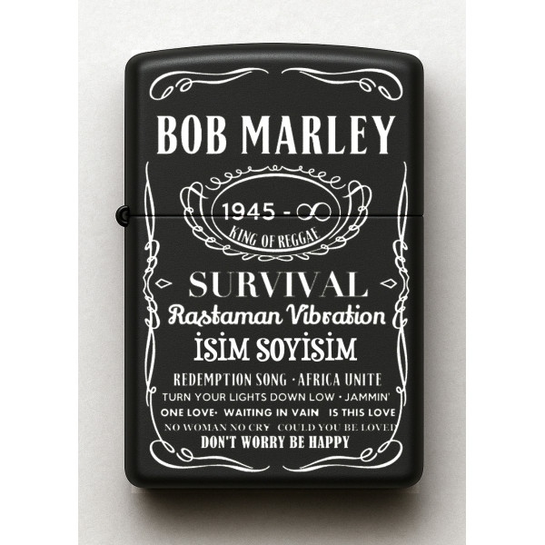 Bob Marley Desenli Kişiye Özel İsimli Siyah Benzinli Metal Çakmak