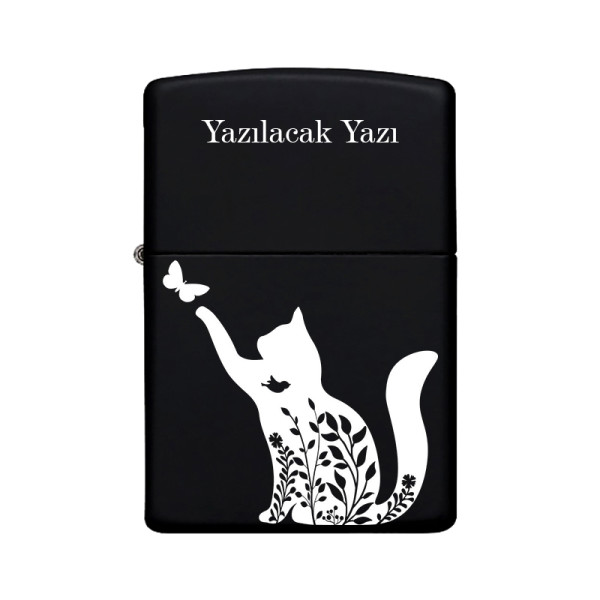 Kedi Desenli Kişiye Özel İsimli Benzinli Siyah Metal Çakmak