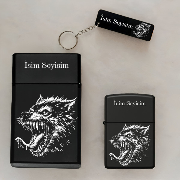 Canavar Kurt Desenli Kişiye Özel Isimli Metal Sigara Kutusu, Benzinli Çakmak ve Anahtarlık Seti S42