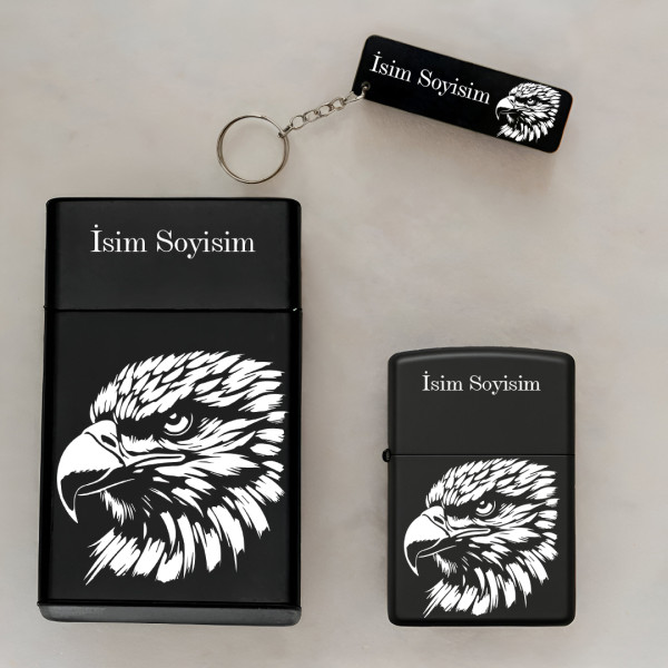 Kartal Desenli Kişiye Özel İsimli Metal Sigara Kutusu, Benzinli Çakmak ve Anahtarlık Seti