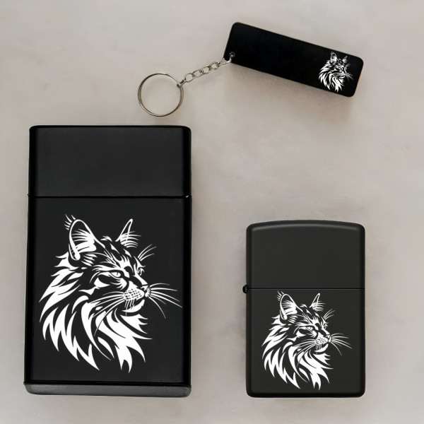 Kedi Desenli Kişiye Özel İsimli Metal Sigara Kutusu, Benzinli Çakmak ve Anahtarlık Seti S63