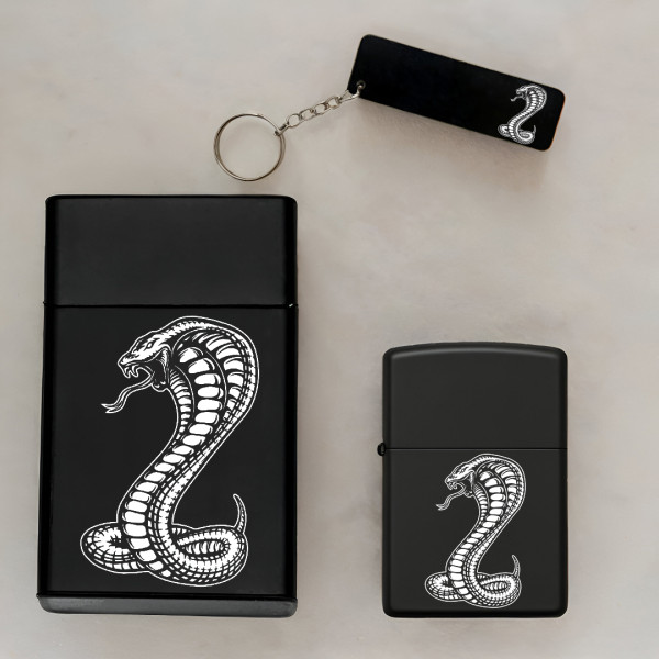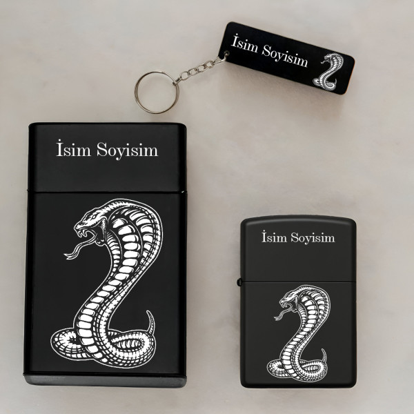 Kobra Yılan Desenli Kişiye Özel İsimli Metal Sigara Kutusu, Benzinli Çakmak ve Anahtarlık Seti S65