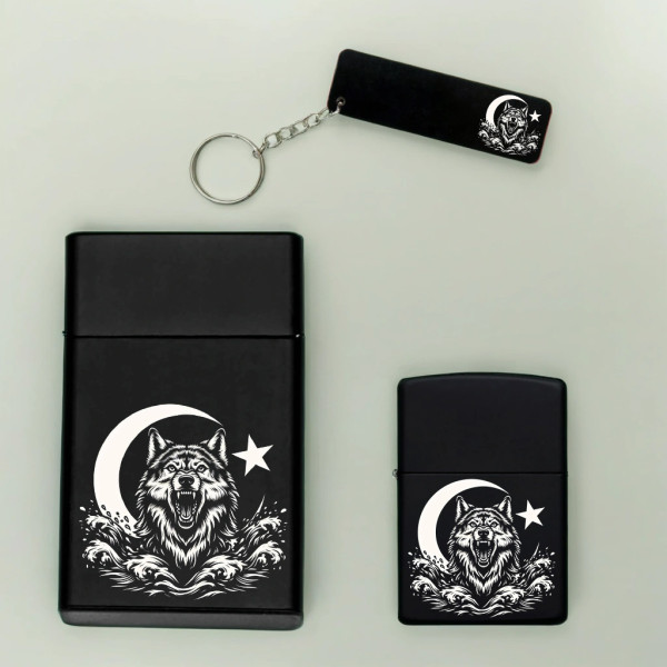 Kurt Ayyıldız Desenli Kişiye Özel Isimli Metal Sigara Kutusu, Benzinli Çakmak ve Anahtarlık Seti