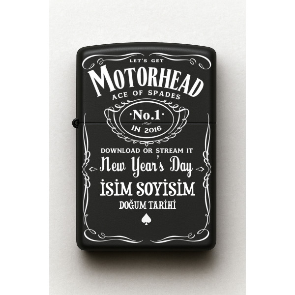 Motorhead Desenli Kişiye Özel İsimli Siyah Benzinli Metal Çakmak