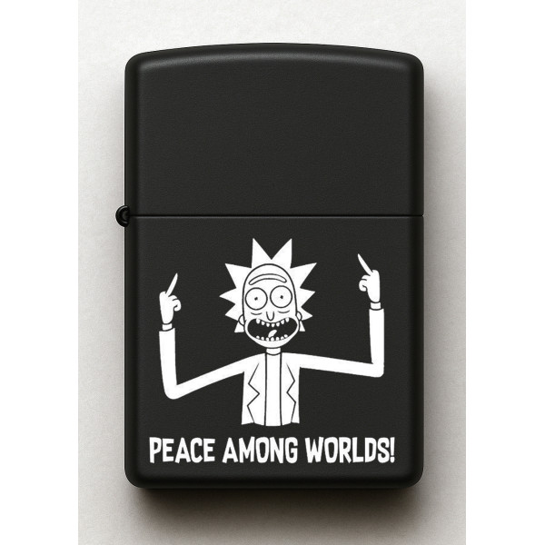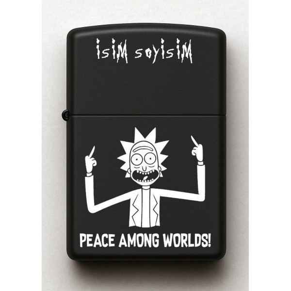 Rick and Morty Peace Among Worlds Desenli Kişiye Özel İsimli Siyah Benzinli Metal Çakmak