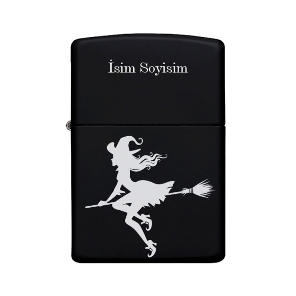 Süpürgeli Cadı Desenli Kişiye Özel İsimli Benzinli Siyah Metal Çakmak